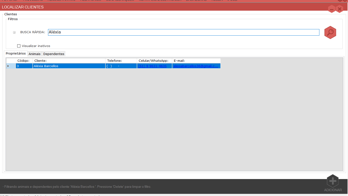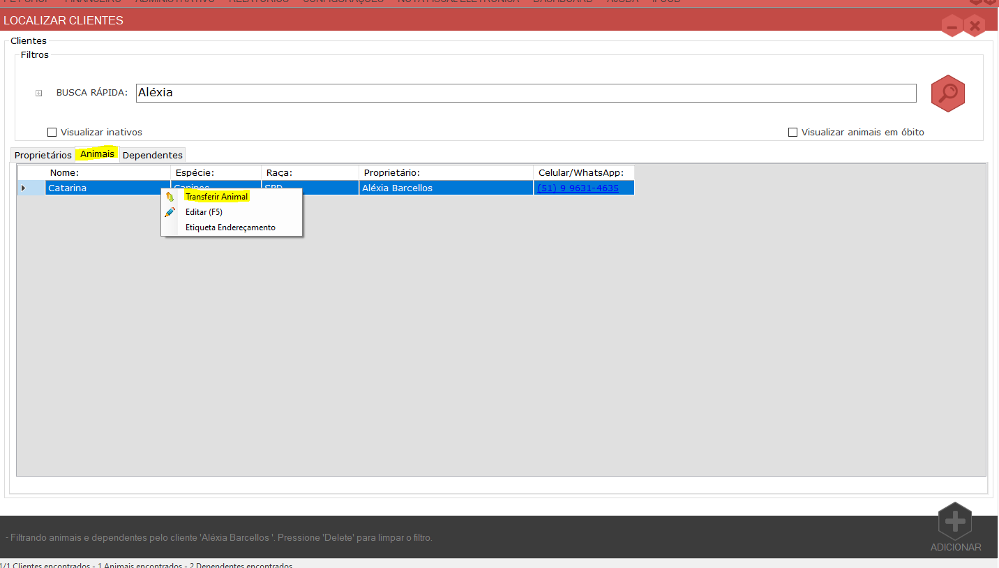 Para isso, vamos na aba Clientes, filtre o cliente que deseja transferir o animal.